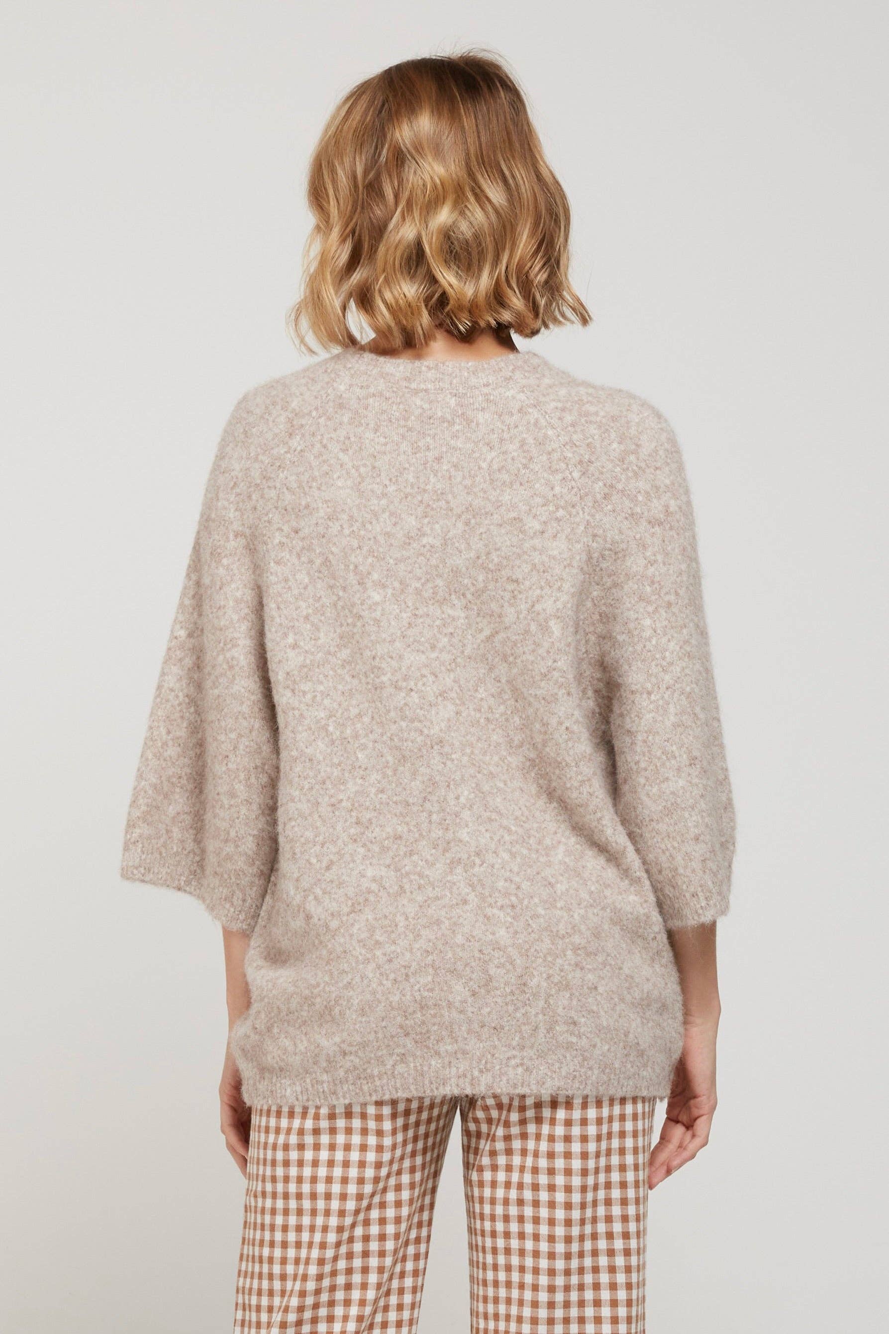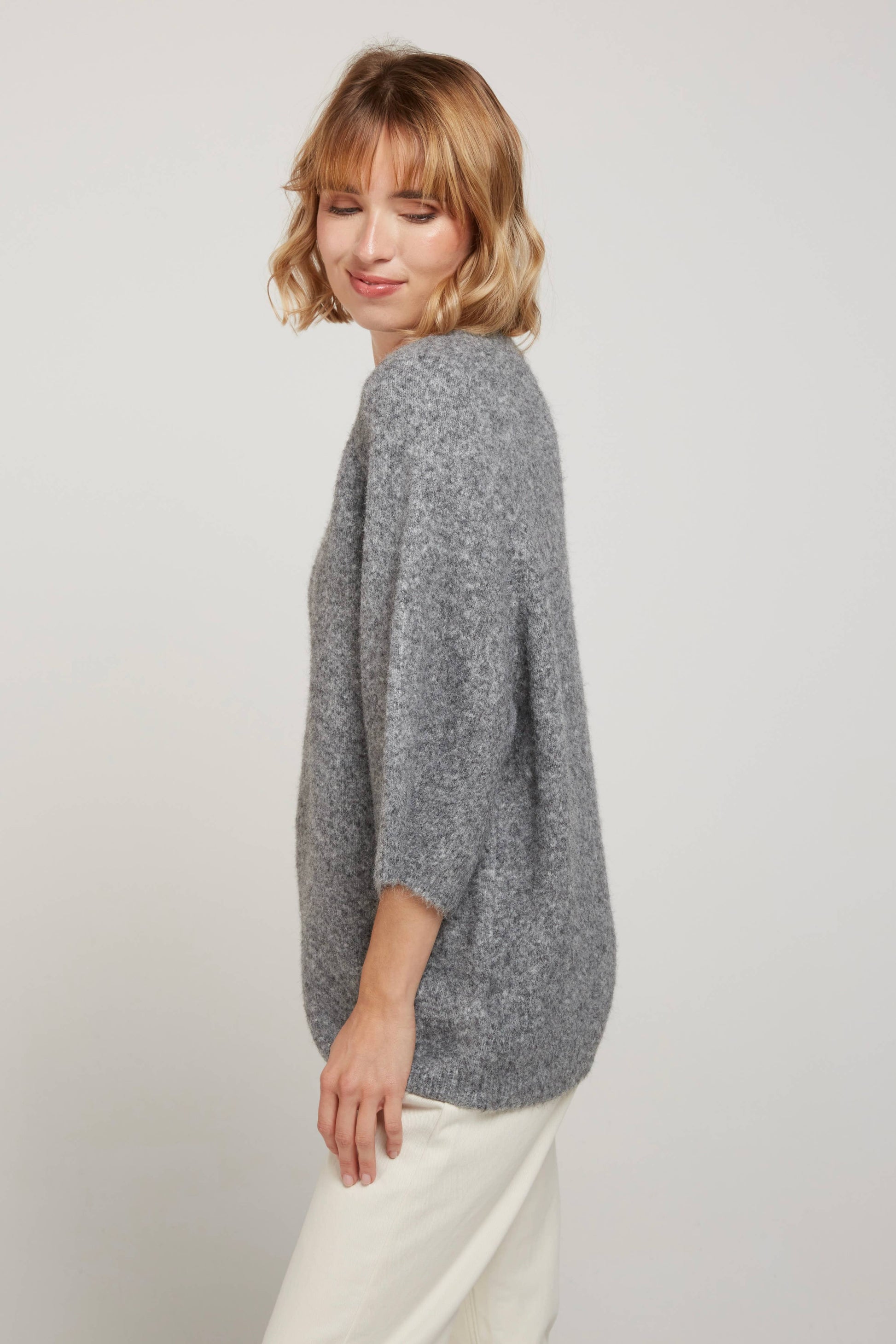 CAMELIA by Andy & Lucy is the essential short-sleeved "cozy" sweater. Ultra-soft fluffy knit, round neck, and slightly loose fit for a cocooning drape. Perfect for mid-season or layered. Wear with ecru jeans, a satin skirt, or a suit for a chic-casual look.