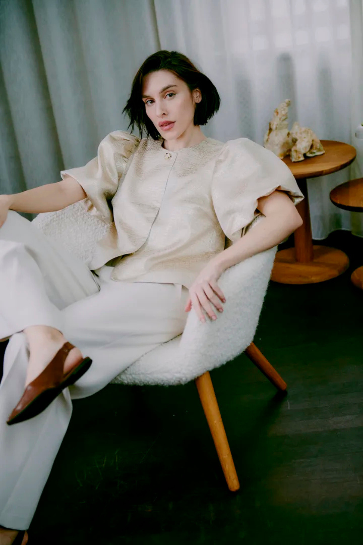Elegant top with statement puff sleeves is designed for comfort and modern style. Features a round neckline, cropped length, and a tailored fit, making it perfect for both formal and casual occasions.
