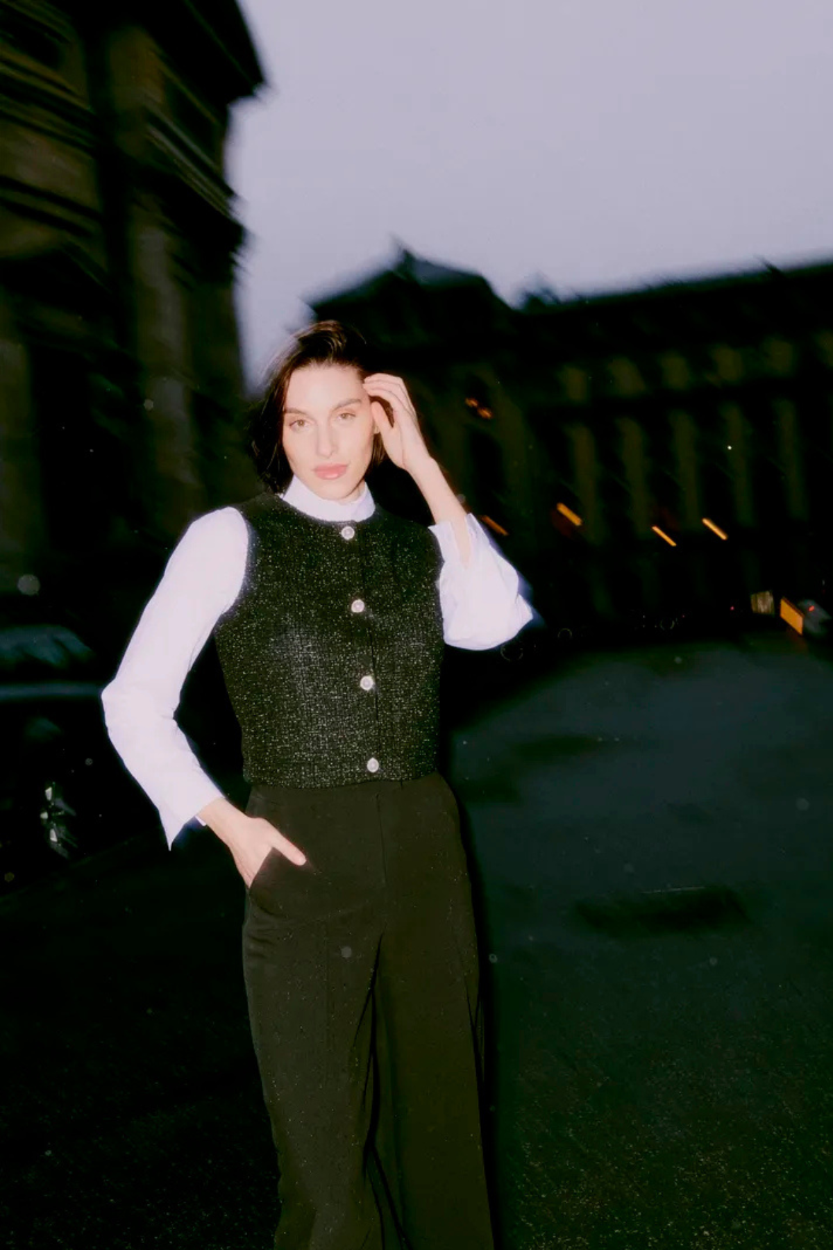 Details: Sleeveless vest, versatile layering piece, elegant and modern design