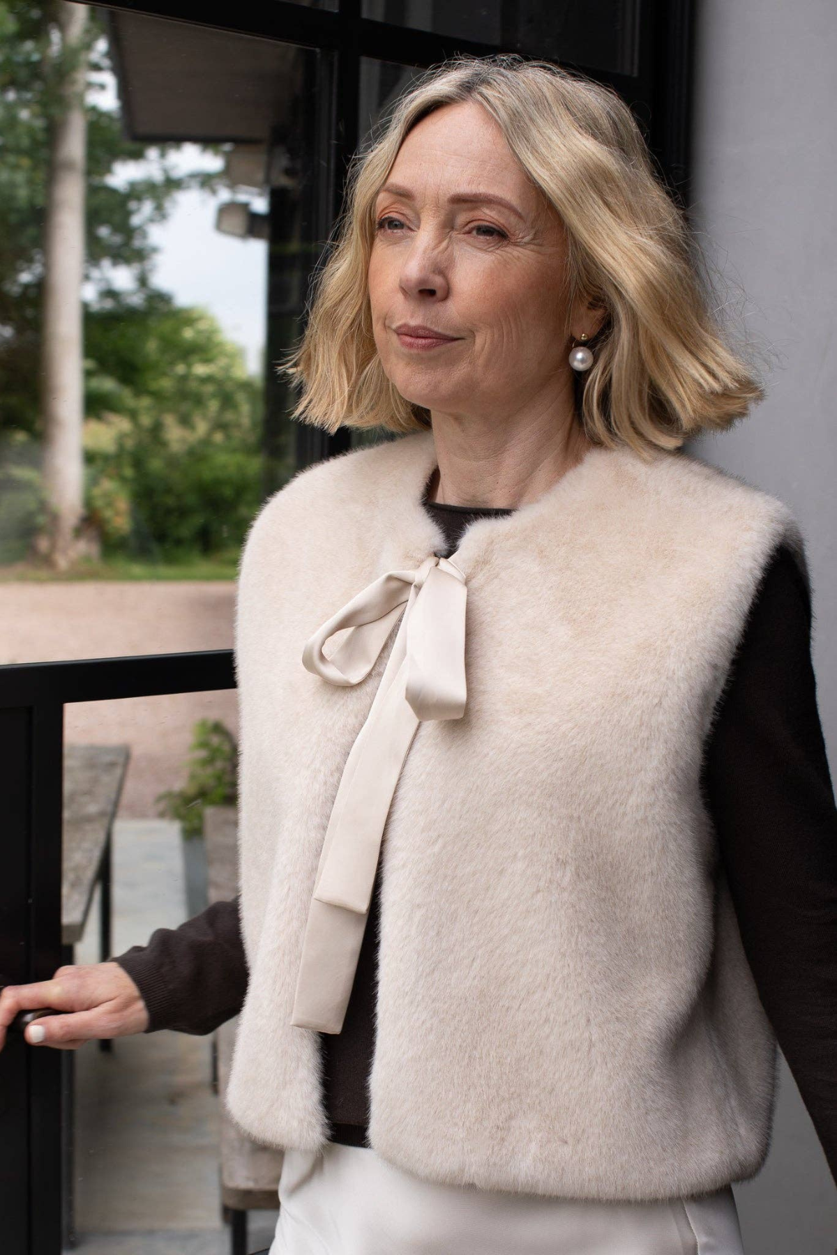 The Felicity Gilet is a super soft faux fur gilet featuring a chic satin tie front at the neck. Designed with a slightly neater fit, this luxurious layer adds warmth and elegance to any outfit - perfect for pairing over knitwear or dresses during cooler days.