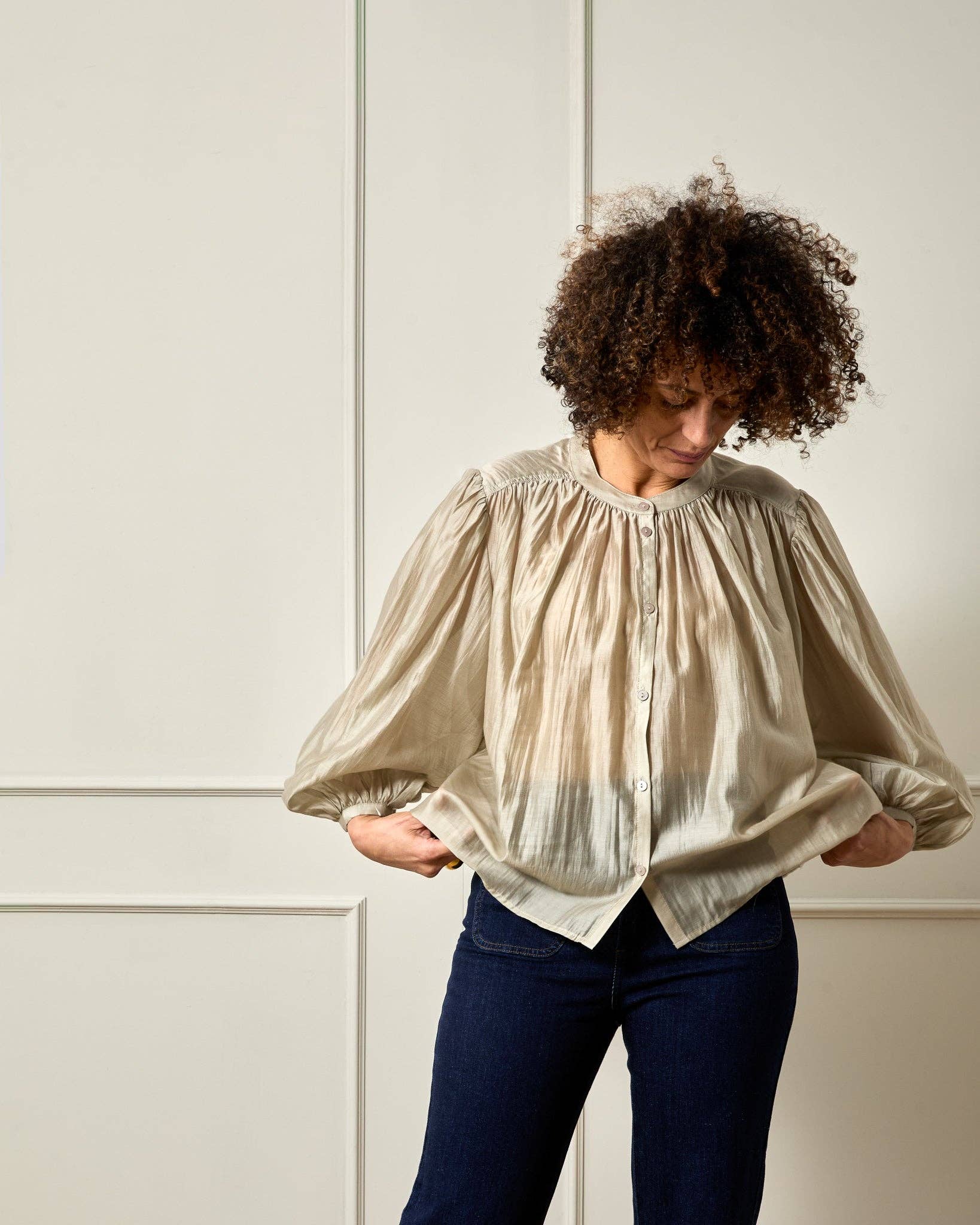 Dawn is a floaty, silky, full sleeve blouse. Designed with a gathered back yoke, button front and grandad collar - Dawn is a romantic blouse shape.