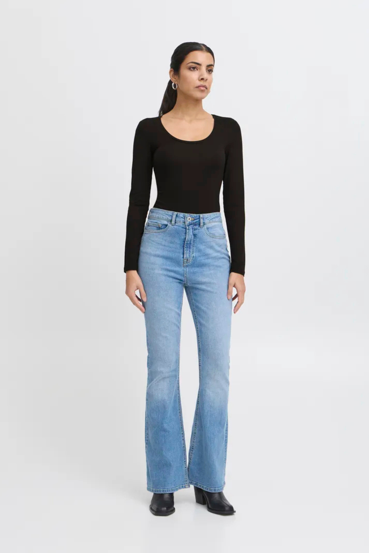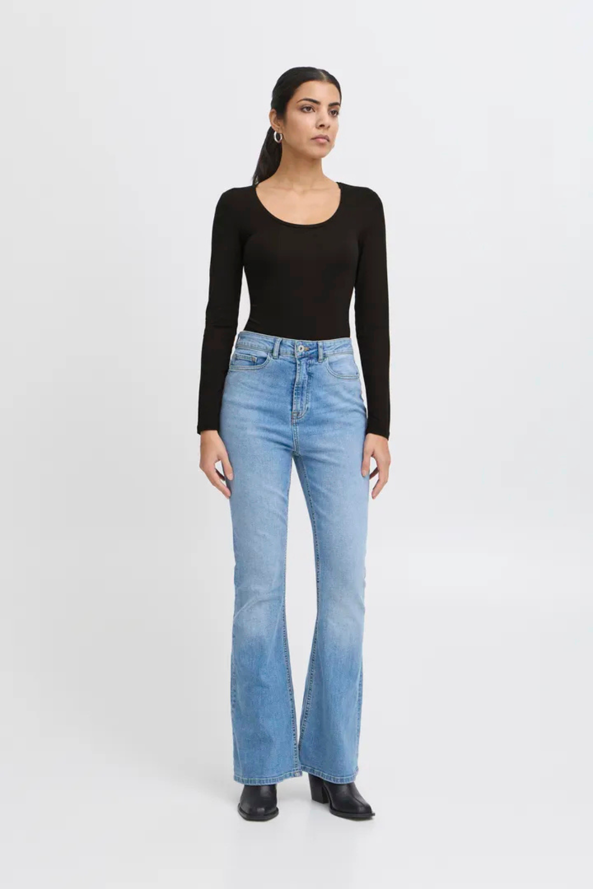 Long sleeve top with scoop neckline and sleek, fitted silhouette. Smooth texture and straight hem make this basic style a versatile, streamlined essential.