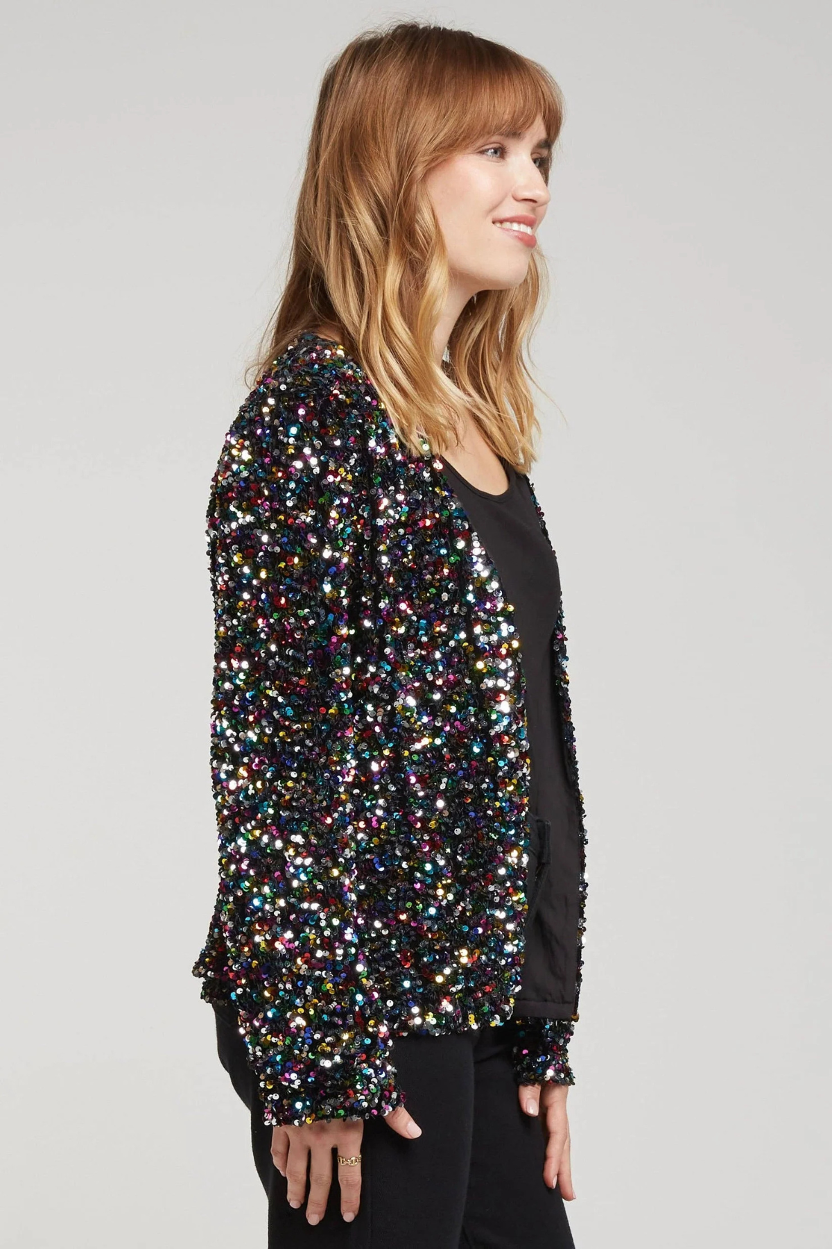 Shine bright in this multi-coloured sequin jacket. Perfect for festive occasions or whenever you want to add a touch of glamour, its relaxed fit and long sleeves ensure all-day comfort. The shimmering sequins catch the light beautifully, making every outfit feel extra special. Pair it with casual pieces or dress it up for a statement-ready look.